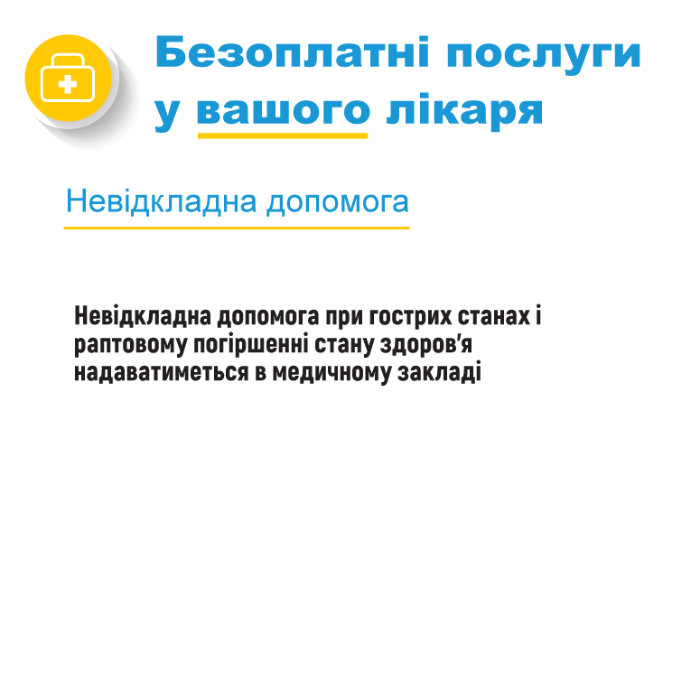 Безоплатні аналізи та дослідження. Сюди входить загальний аналіз крові з лейкоцитарною формулою, загальний аналіз сечі, глюкоза крові, загальний холестерин, електрокардіограма, швидкий текст на вагітність, швидкі тести на ВІЛ, вірусні гепатити.